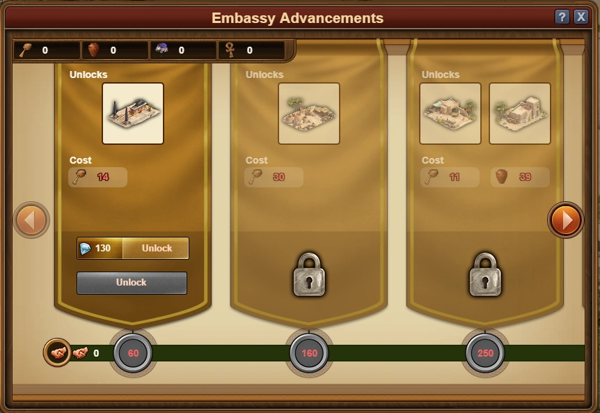 Embassy Advancements have to be unlocked in order to build new settlement buildings and to be able to unlock the next advancement. Embassy Advancements can be unlocked by paying a certain amount of cultural goods, while having the requested amount of diplomacy. Although the total amount of cultural goods and the type of goods is the same for every player, the amount of each good can be different.