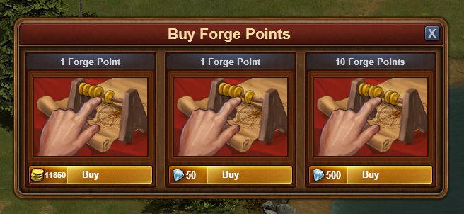 At lower eras like Bronze Age / Iron Age, it might not be worth it to buy forge points for coins, as the prices quickly become abnormal. At this level it is best to wait for the hourly forge points.
